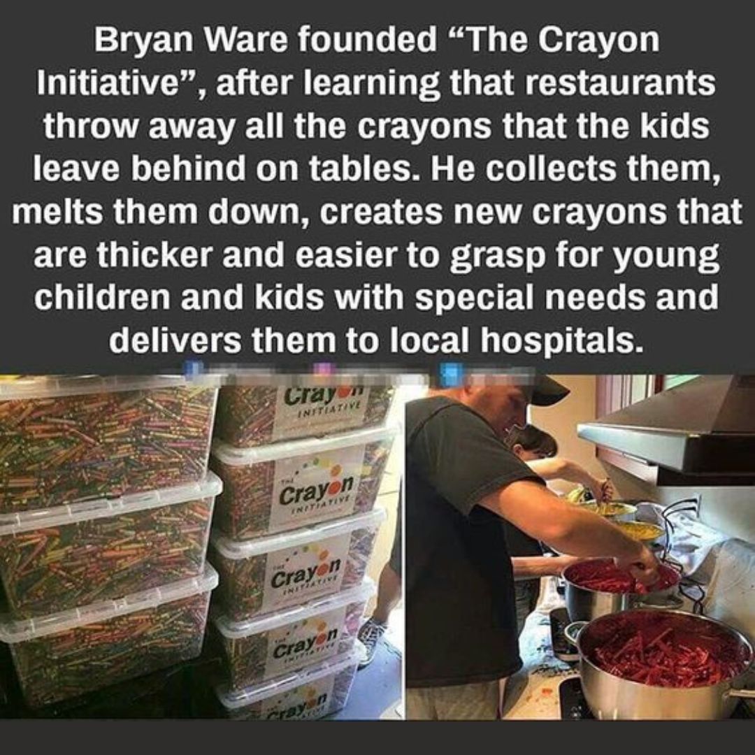 Sometimes, the most beautiful acts of kindness begin with the simplest observations. When Bryan Ware learned that restaurants across America were throwing away thousands of crayons left behind by children, he saw not waste — but opportunity. 🌈✨ What others saw as trash, he saw as a chance to spark joy. Bryan began collecting these discarded crayons, melting them down, and crafting new, thicker crayons — perfectly designed for young children and kids with special needs who struggle to hold regular ones. 🖍️💫 Each crayon he creates carries more than color — it carries comfort, creativity, and hope.