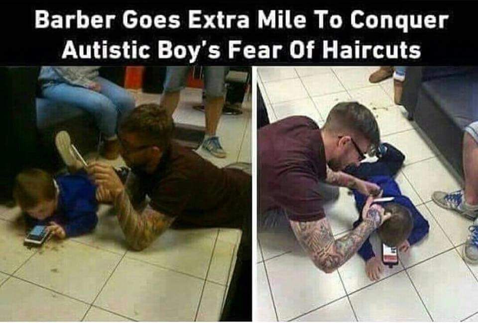 In a world that often rushes past quiet struggles, this image captures a moment of pure empathy. When a barber realized his young customer β a little boy with autism β was terrified of haircuts, he didnβt insist, didnβt scold, and didnβt give up. Instead, he lay down on the floor beside him, clippers in hand, meeting the child exactly where he felt safe. β€οΈ