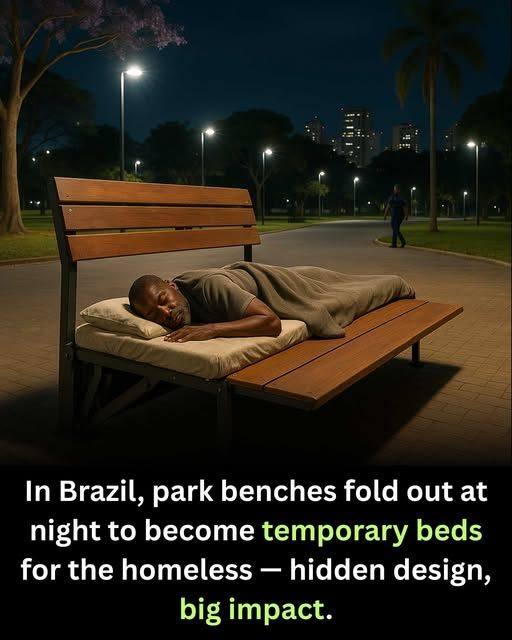 In the busy heart of Brazil’s cities, where the streets are filled with the rhythm of daily life, a quiet and powerful change is taking place. It’s not marked by loud speeches or grand campaigns, but by something far simpler—kindness. In public parks and sidewalks, ordinary benches are being transformed into something extraordinary. By day, they serve as regular seating for passersby; but by night, they unfold into safe, flat beds for the homeless. These benches may look simple, but they carry a message far greater than their design: that even in hard times, dignity and care should never be lost.
