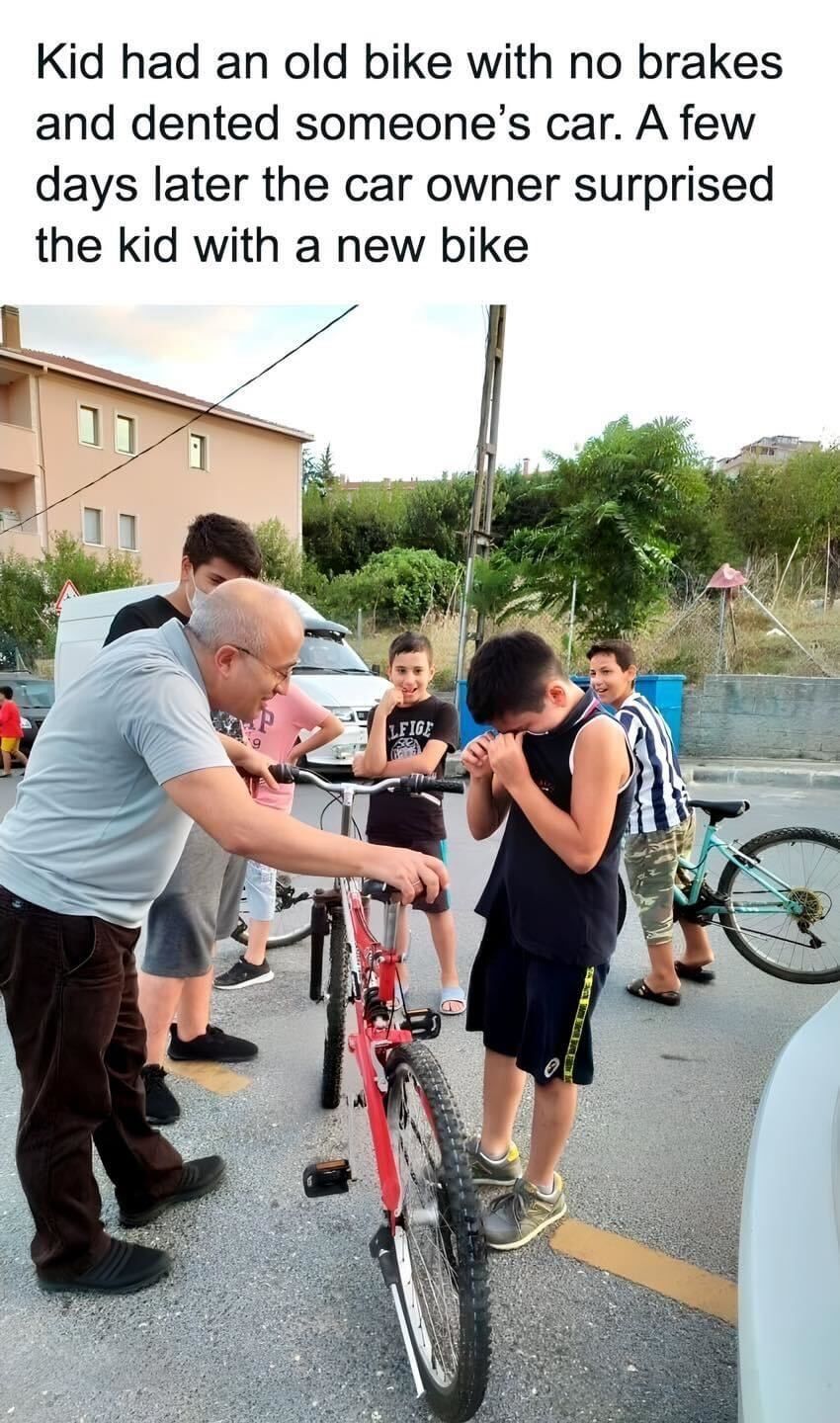 In a world where anger often meets mistakes, this story reminds us that compassion is still the greatest response. 🌍💫 The photo shows a young boy standing in tears beside his broken bicycle — a bike so old and worn that its brakes had stopped working. One day, while trying to ride, he accidentally lost control and dented a stranger’s car. Instead of scolding or punishing him, the car owner simply helped calm the frightened child and sent him home safely. But a few days later, something extraordinary happened. The man returned — not to demand payment, but to gift the boy a brand-new bicycle. 🚲✨