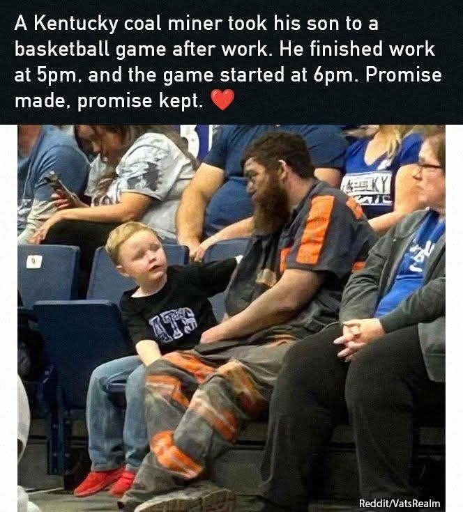 This photograph speaks louder than any words could — a father, still in his work uniform, covered in coal dust, sitting proudly beside his young son at a basketball game. 🏀 The story behind it is simple yet profoundly moving. After finishing his shift at the Kentucky coal mine at 5 p.m., this father had just one hour before tip-off. He didn’t go home to clean up, didn’t rest, didn’t change — he just kept his promise. ❤️ He rushed straight from the mines to the stadium, still wearing the marks of his labor, because he had promised his son they’d watch the game together.