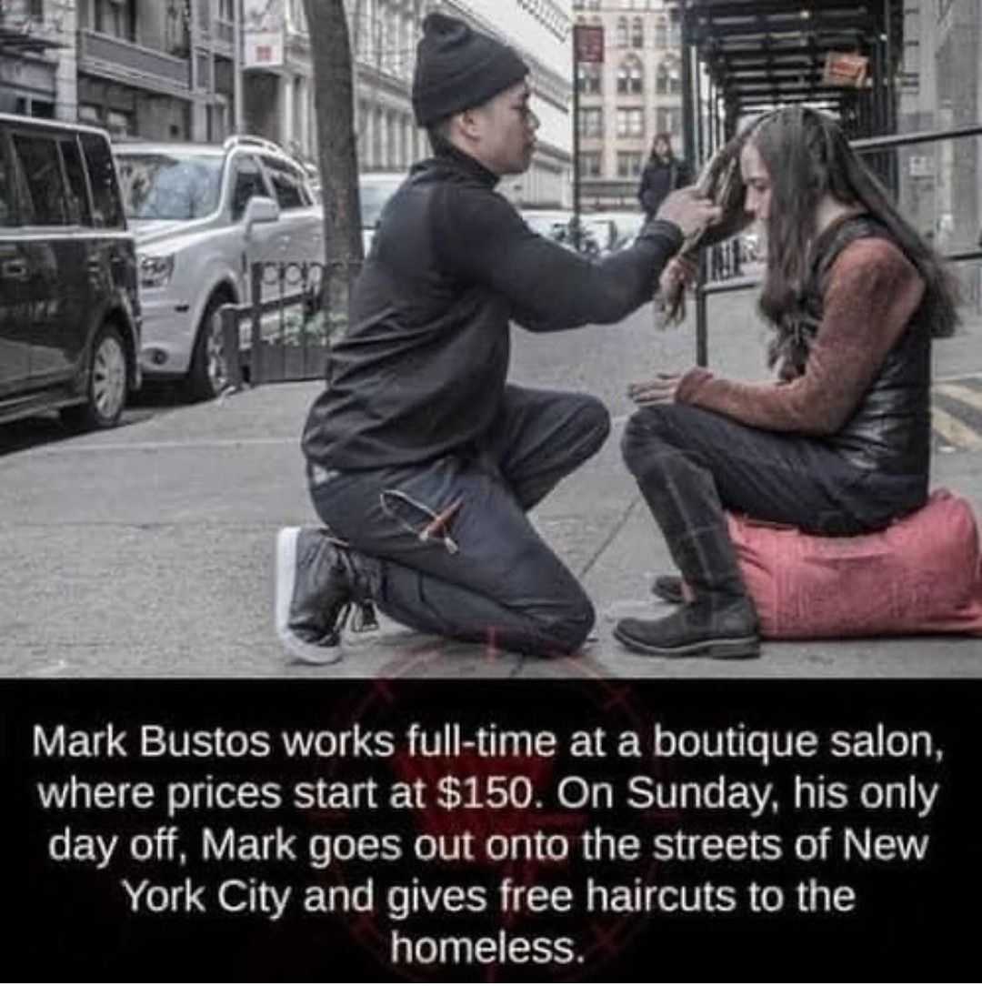 In the bustling streets of New York City, where people often rush past the homeless without a glance, one man kneels — not to give charity, but to restore dignity. 🌆✨ His name is Mark Bustos, a professional hairstylist who works full-time at an upscale boutique salon where haircuts start at $150. Yet, on Sundays — his only day off — Mark transforms city sidewalks into open-air salons of kindness. Armed with scissors, compassion, and humility, he walks the streets offering free haircuts to the homeless, along with something far more valuable — respect. 🙏💫