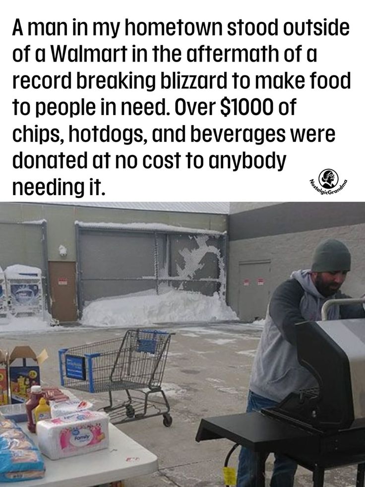 When the world turned white and still under the weight of a record-breaking blizzard, one man refused to stay inside and watch others struggle. Instead, he stepped out into the freezing cold, fired up a grill in front of a Walmart, and began cooking — not for profit, but for people. 🌭❤️