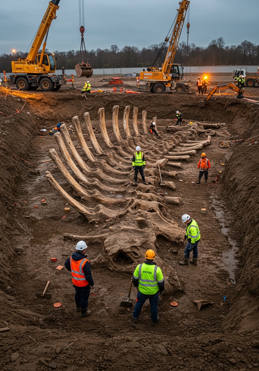 A construction crew working on a major development project has made a discovery that is now gripping the world’s attention: a massive ribcage-like structure unearthed several meters below ground. The skeletal formation, reportedly stretching across the width of the excavation pit, appears to belong to a creature far larger than any species known to science. Workers halted operations immediately as archaeologists and geologists were dispatched to the site to conduct a preliminary assessment. Early images show curved, symmetrical bones emerging from compacted layers of sediment — so enormous that even heavy machinery seems small beside them. The find has triggered global fascination and alarm, with speculation ranging from an undiscovered prehistoric giant to remnants of a long-lost species erased from the fossil record.