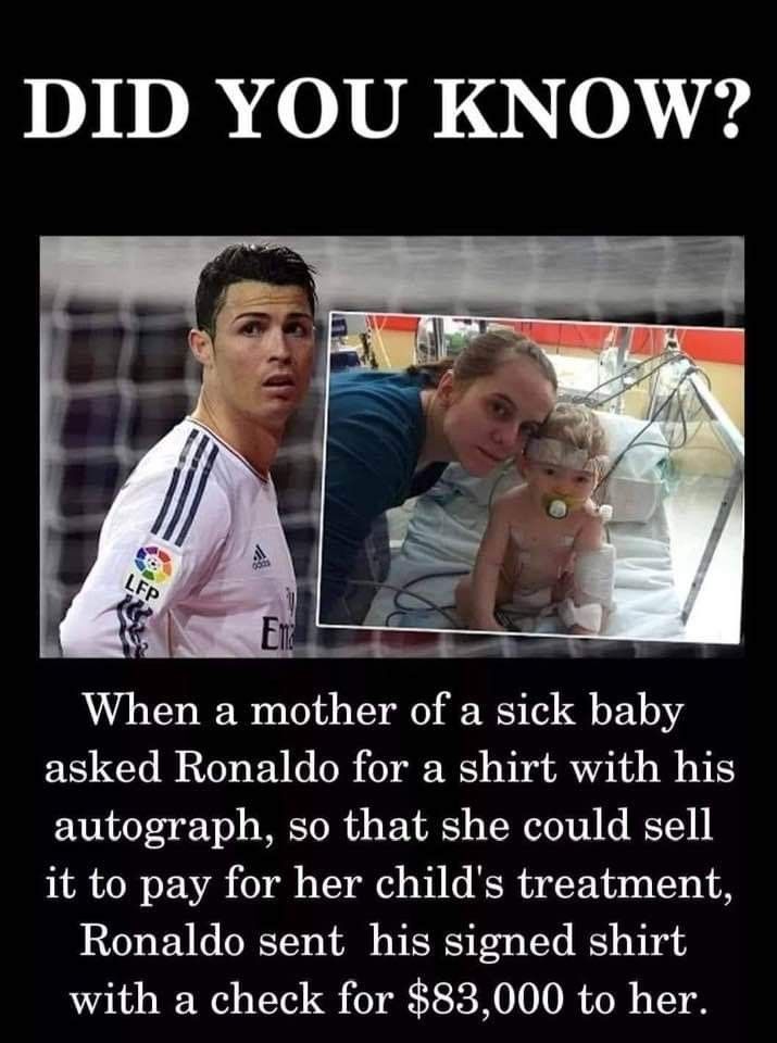 In a world where fame often builds walls, Cristiano Ronaldo chose to break them with compassion. When a desperate mother reached out to him, asking only for a signed shirt to sell for her sick child’s treatment, Ronaldo didn’t just respond—he changed a life. Instead of sending merely an autograph, he sent his signed jersey along with a check for $83,000—enough to cover the child’s medical expenses in full. 💖