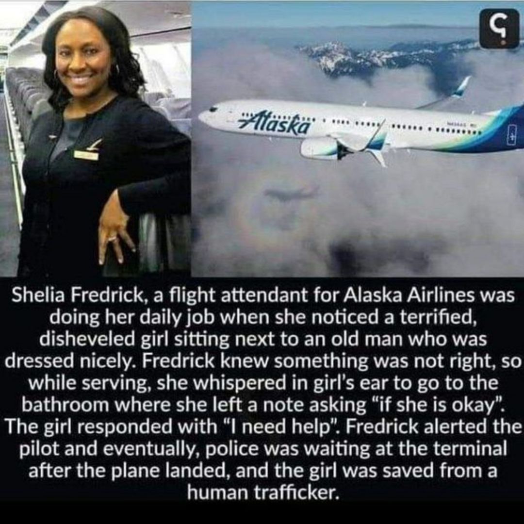 Sometimes, heroes donโt wear uniforms of warโthey wear the calm smile of a flight attendant. Shelia Fredrick, while working for Alaska Airlines, was simply doing her daily duties when she noticed something unusual: a frightened, disheveled young girl sitting next to a well-dressed older man. Her instincts told her something was terribly wrong. ๐๏ธ