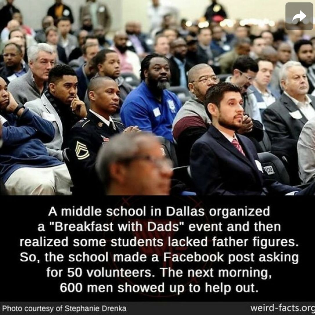 At a middle school in Dallas, Texas, a simple idea turned into a moment that touched the world. The school had planned a โBreakfast with Dadsโ event โ a time for students to share a meal with their fathers or mentors. But as organizers realized, some children didnโt have a dad or father figure to attend. So, they posted a humble request on Facebook, asking for 50 volunteers to fill in. ๐
