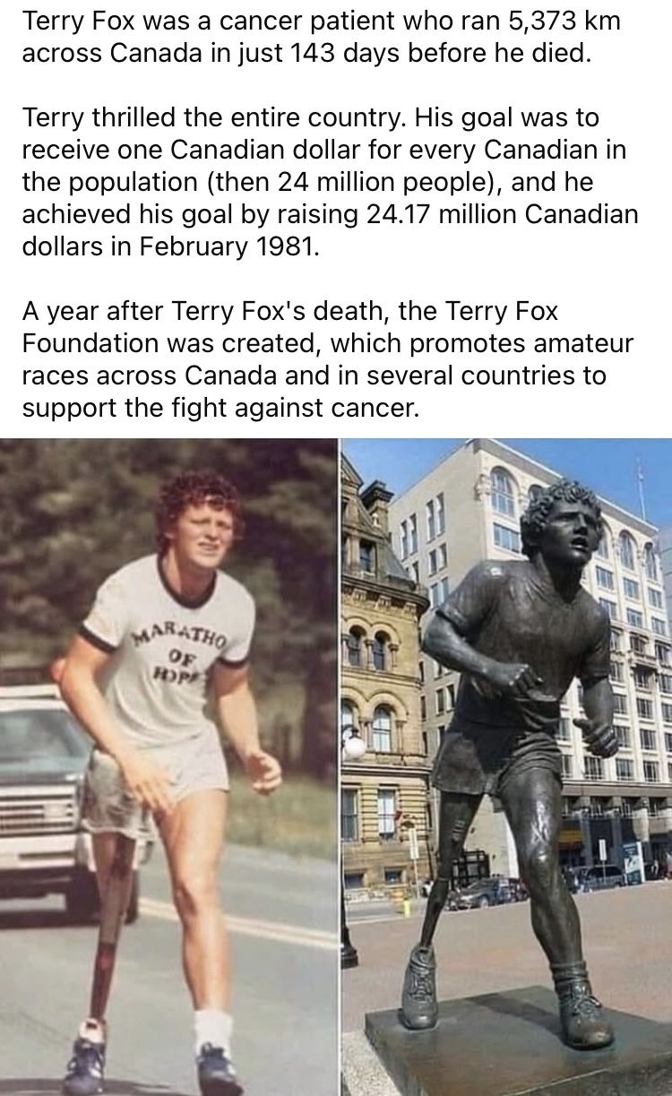 #TerryFox #MarathonOfHope #CancerAwareness #HeroOfHumanity #NeverGiveUp #InspiringStories