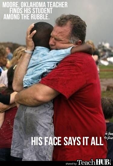 Amid the wreckage left by a devastating tornado in Moore, Oklahoma, one teacher searched through the shattered remains of what used to be a school — not for books or belongings, but for the beating hearts he had sworn to protect. And then, through the dust and tears, he found him — his student, alive, frightened, clinging to hope. In that moment, without a word, the teacher wrapped the child in his arms, holding him as if the world could crumble again but their bond never would. 🤍
