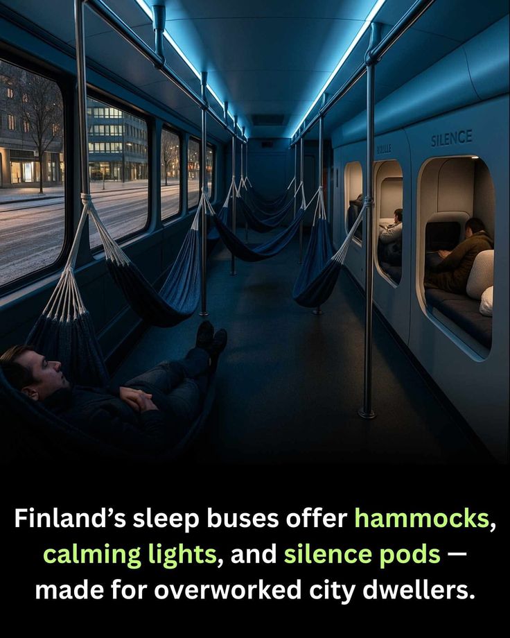 Imagine stepping into a softly lit bus after a long day — the hum of the engine replaced by calming stillness, the seats replaced with swaying hammocks that cradle you into rest. Here, no one rushes. No one scrolls. Time slows, and serenity takes the wheel. 🚏✨ In a world where burnout has become the norm, Finland’s solution is a gentle reminder that rest isn’t a luxury — it’s a human necessity. 🌿