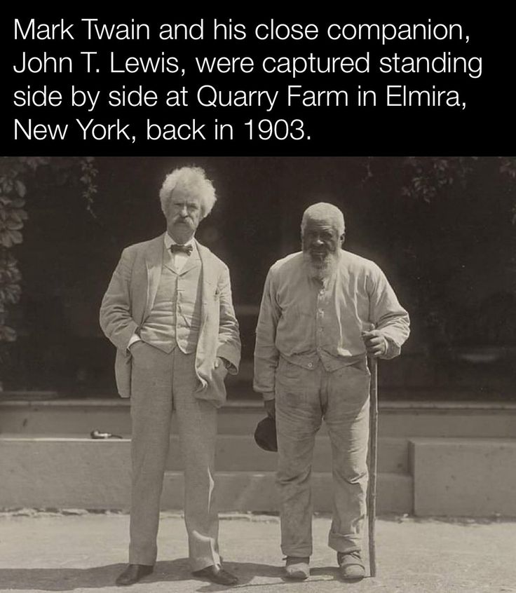 In this rare photograph taken in 1903 at Quarry Farm in Elmira, New York, the legendary writer Mark Twain stands beside his lifelong friend John T. Lewis, a man whose quiet strength and integrity left a profound mark on the famous authorโs life. ๐ฟ The image captures more than just two figures in history โ it captures a bond that defied the social barriers of their time. โค๏ธ