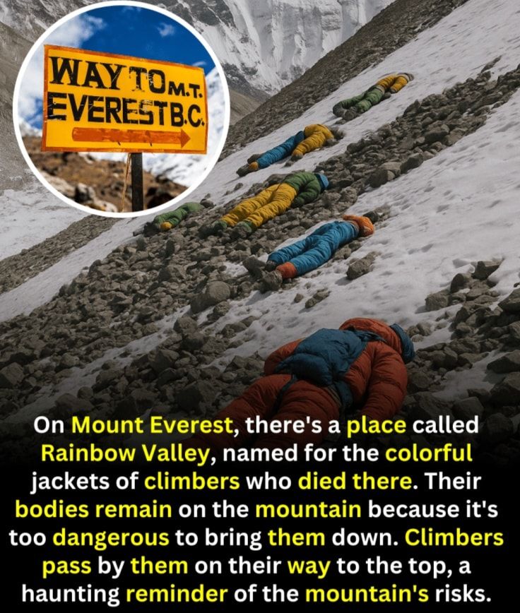 High above the clouds, where the air is thin and the wind howls like a ghost, lies one of the most haunting places on Earth โ Rainbow Valley, on the slopes of Mount Everest. Itโs a name that sounds beautiful, but its beauty is born of tragedy. The valley gets its name from the brightly colored jackets of fallen climbers whose bodies remain frozen along the route, forever preserved by the icy temperatures. ๐งโโ๏ธโ๏ธ