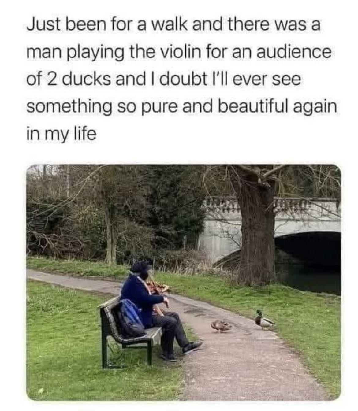 On an ordinary walk through the park, someone stumbled upon something extraordinary β a man sitting quietly on a bench, playing his violinβ¦ for an audience of two ducks. π¦π¦πΆ